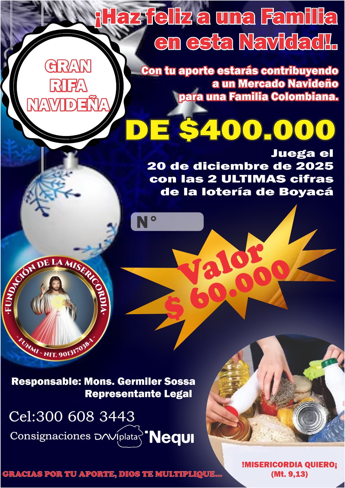 Saludos para tod@s. Cada año nuestra Fundación se compromete con la ayuda de ustedes benefactores a dar alegría a familias en Colombia con estos mercados navideños. Este año iniciamos esta campaña; la meta son 150 mercados este año para la navidad. La compra de cada rifa, significa un mercado para una familia. Cada mercado irá valorado en 60 mil pesos colombianos.